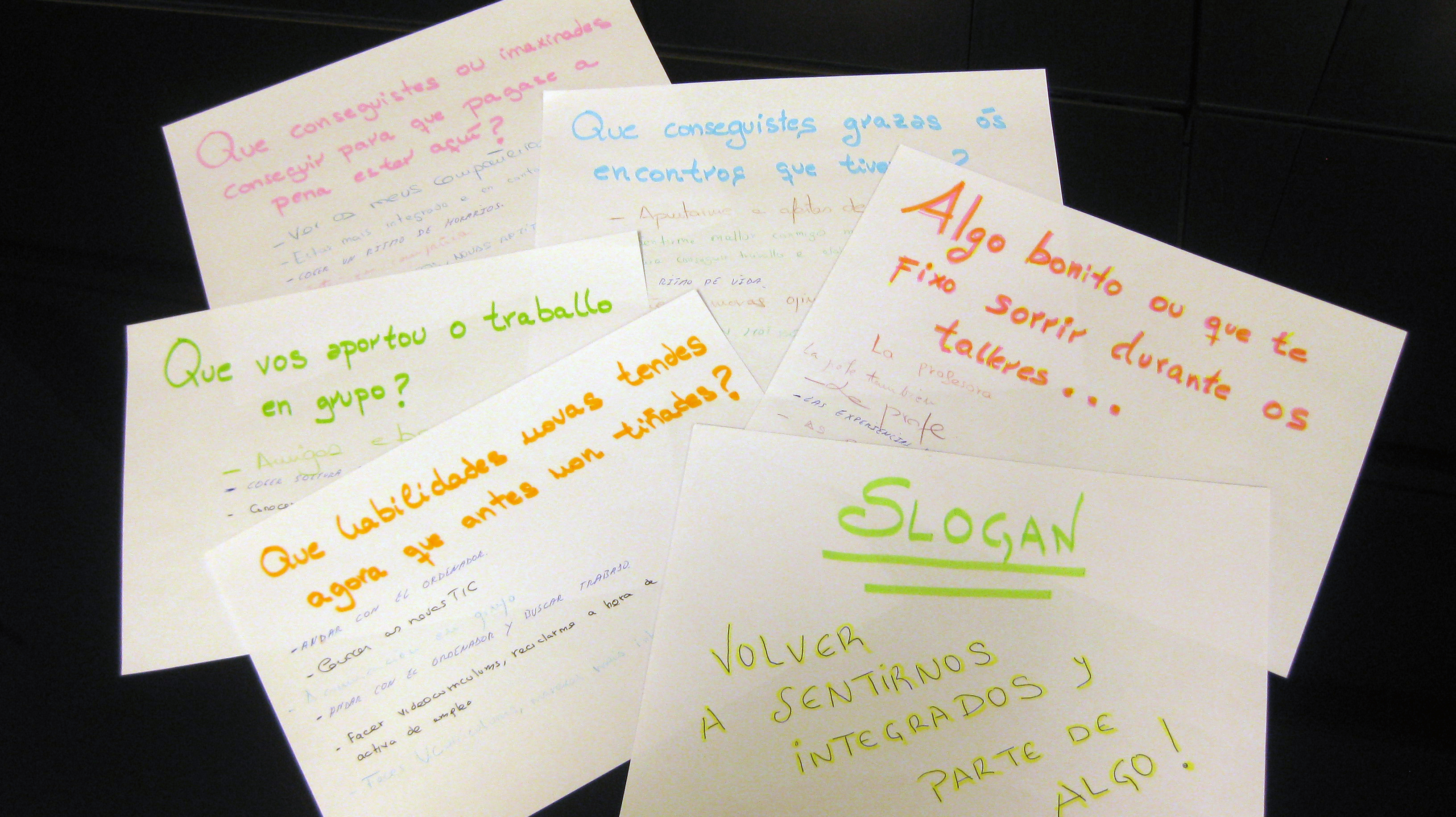 IMG_0825Despois de traballar estas preguntas por grupos, os participantes comentaron en alto as apreciacións comúns e expuxeron as súas sensacións sobre as sesións realizadas ó longo do curso. A continuación, fixeron gala da súa creatividade elaborando un slogan que representase todas as ideas: “Volver a sentirnos integrados e parte de algo”.